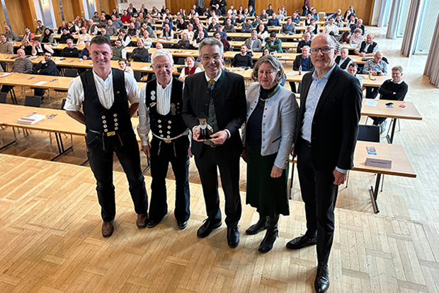 V.l.n.r.: Bezirksvorsitzender Oberbayern Thomas Pichler, Präsident LIV Peter Aicher, Bürgermeister Stephan Schlier, Repräsentantin der Unternehmerfrauen Brigitte Bscheider und Hauptgeschäftsführer LIV Kai Gajewski.