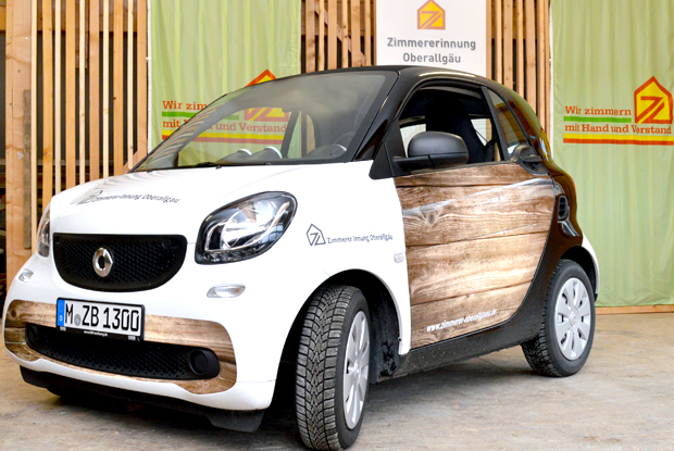 Über einen Smart samt werbewirksamer Holzbau-Gestaltung freuen sich die Mitglieder der Zimmerer-Innung Oberallgäu. Sie haben den Smart zur einjährigen Nutzung auf dem Bayerischen Zimmerer- und Holzbaugewerbetag im Oktober 2018 in Augsburg gewonnen.